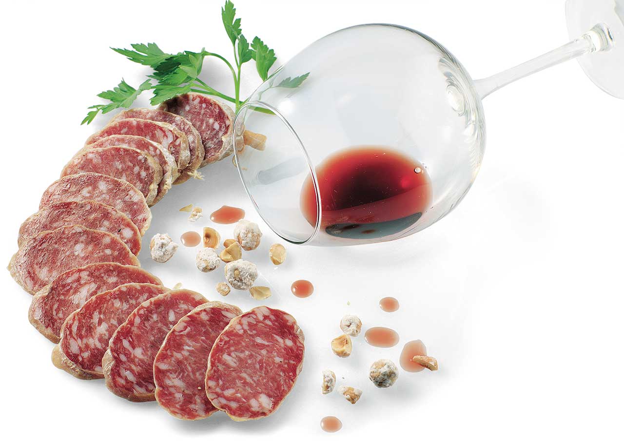With a strong yet delicate flavour, the salami with Barolo wine from Salumificio Chiapella brings two Langhe specialities together: salami and wine. And not just any wine, but an exquisite nectar that requires at least three years of ageing, which transfers to the meat all the wisdom of our hills that it absorbs during the resting phase. The mixing and casing of the ingredients is followed by two curing stages in which the product is first dried, then cured to perfection in an environment of constant temperature and humidity. This results in a recognisable combination of flavours and aromas when tasted.